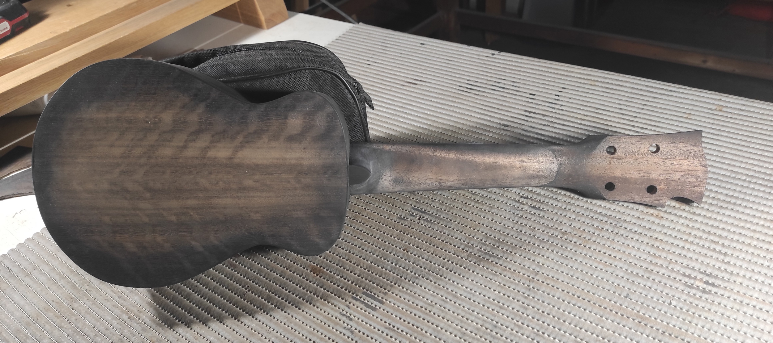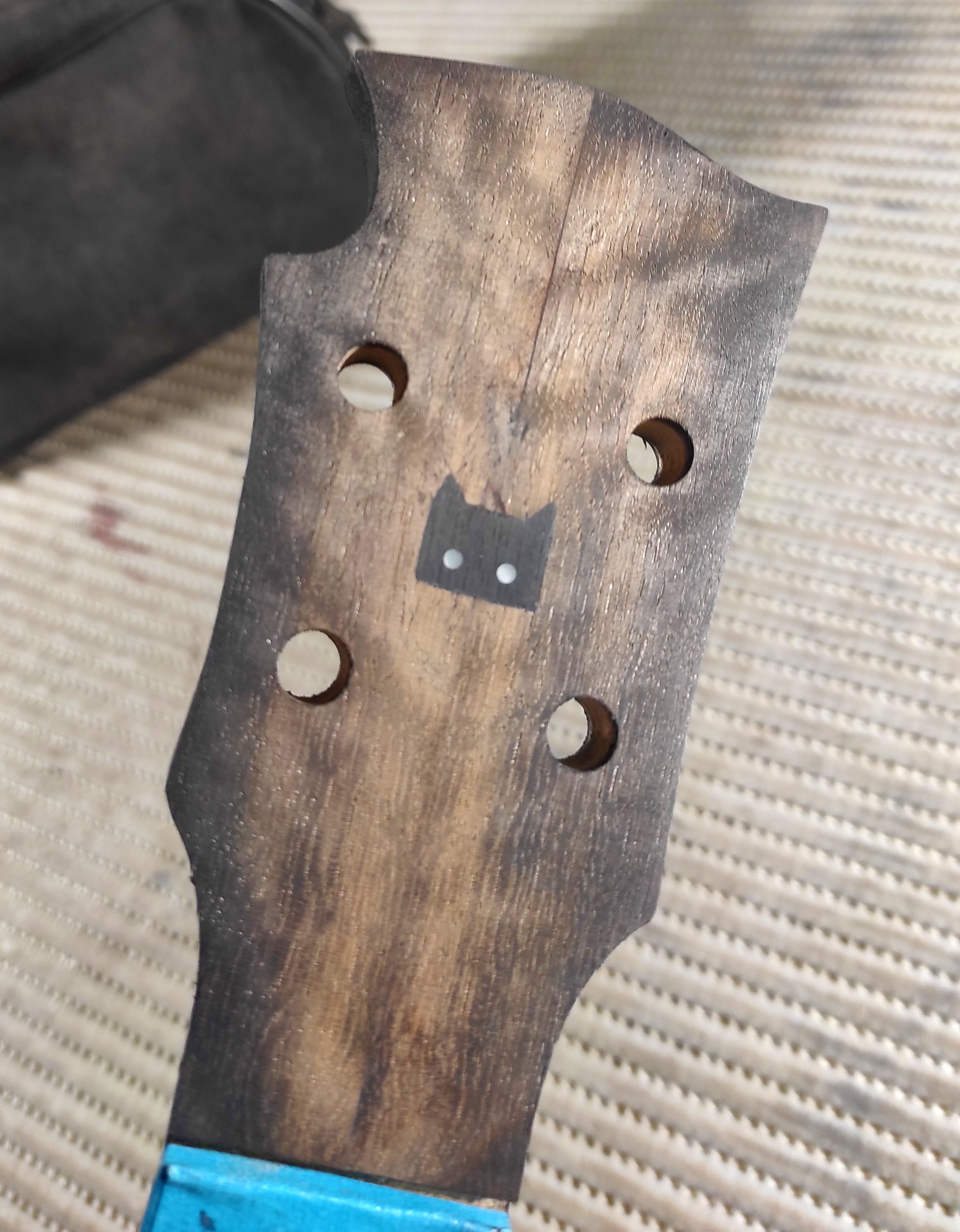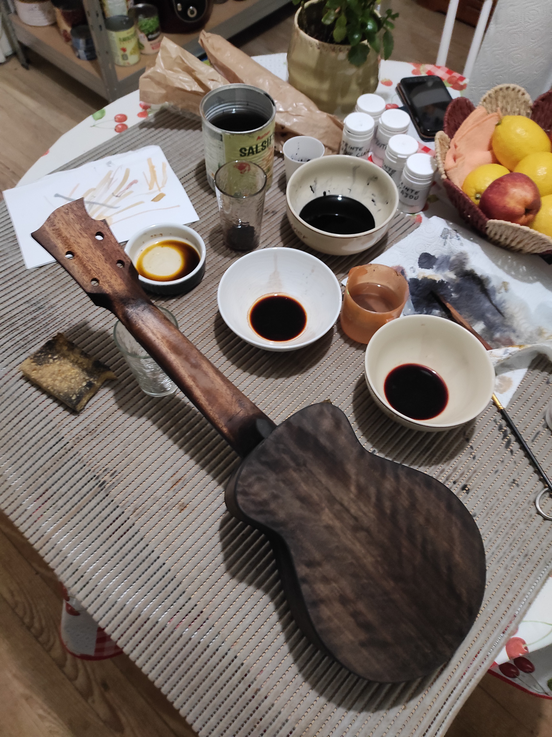 Il y a quelques années j'ai fait un truc dans la même veine sur une de mes fabrications de l'époque, un sunburst (très burst le sun pour le coup) et vernis par dessus, ça donnait ça !