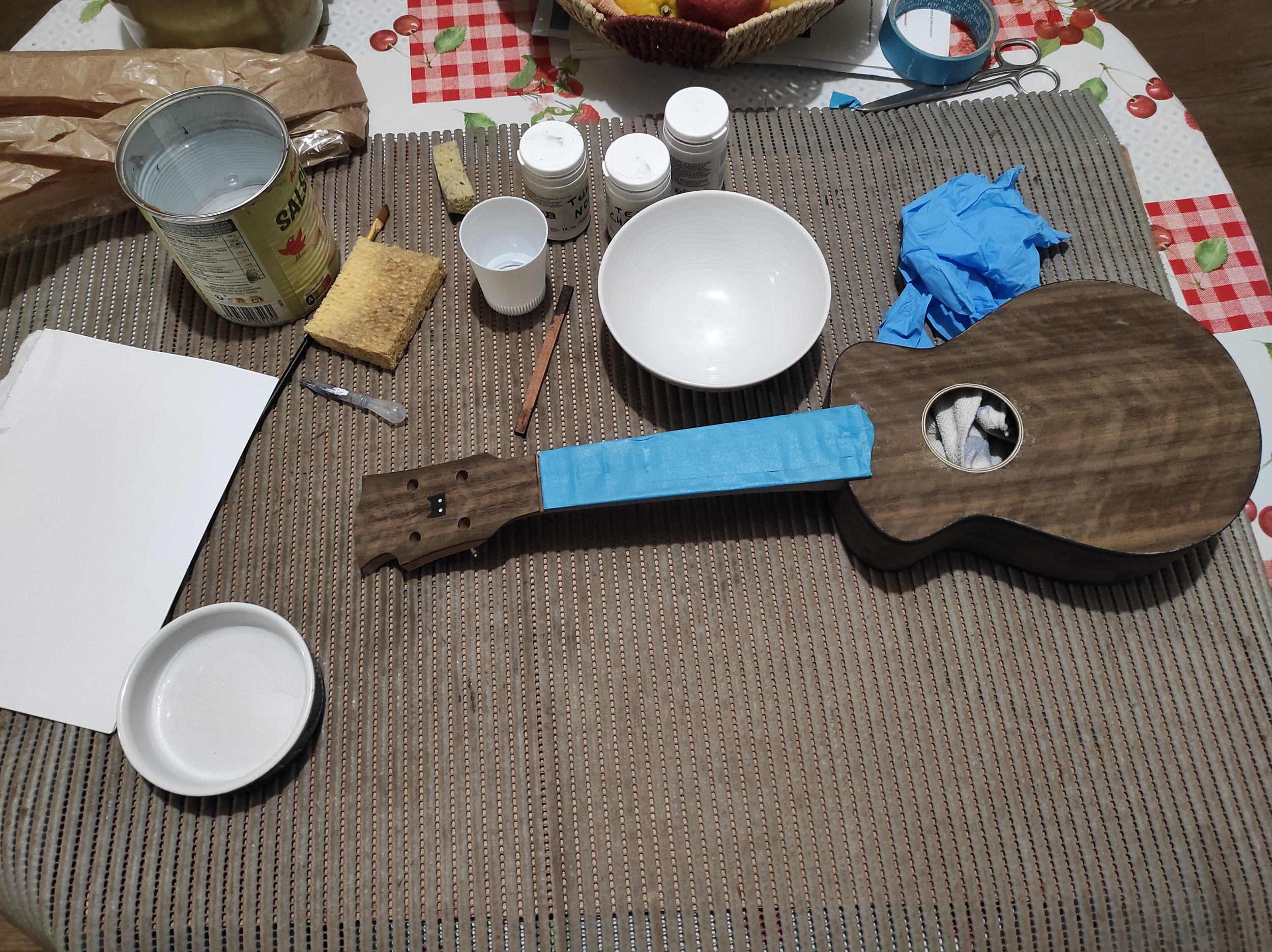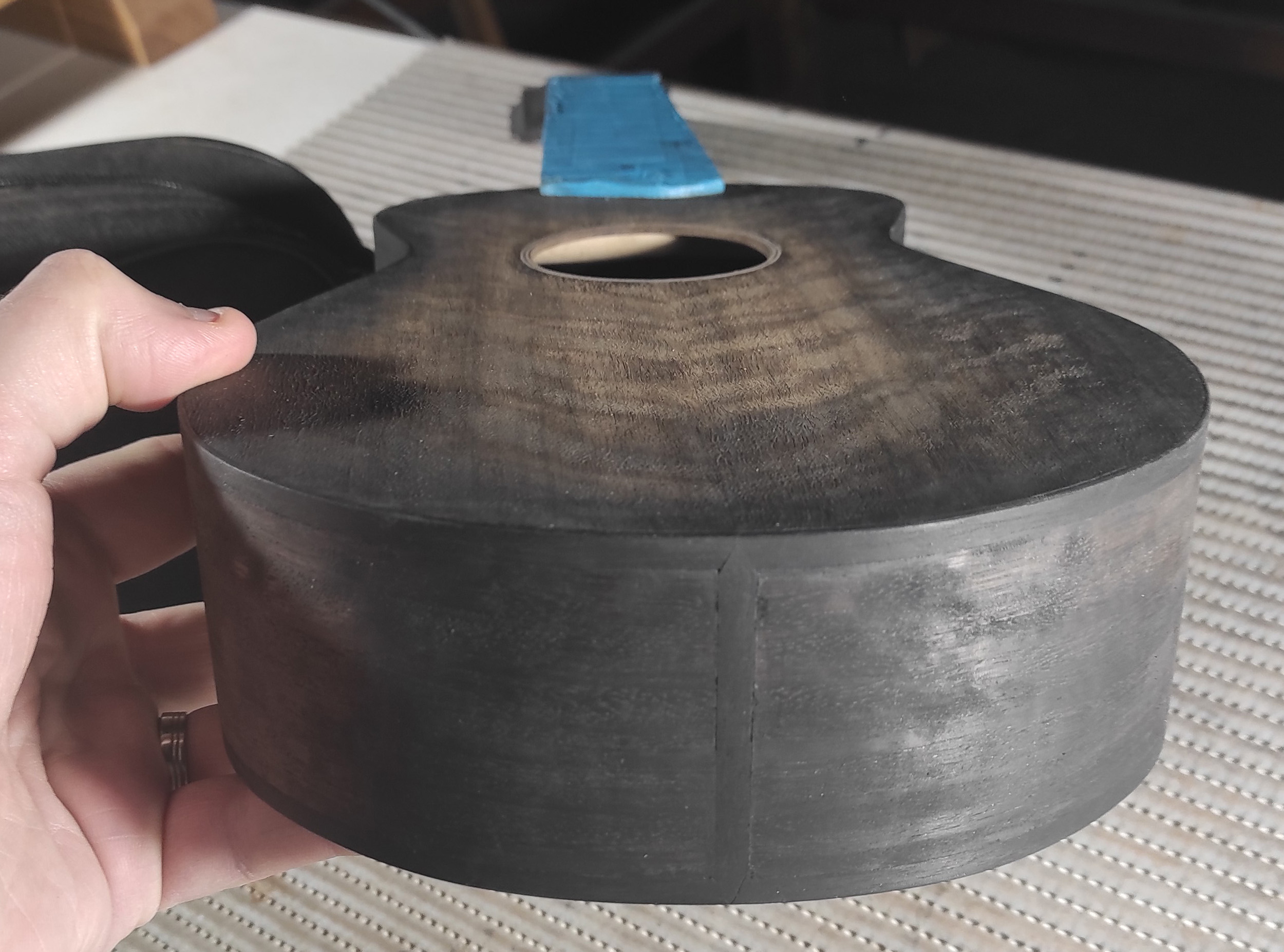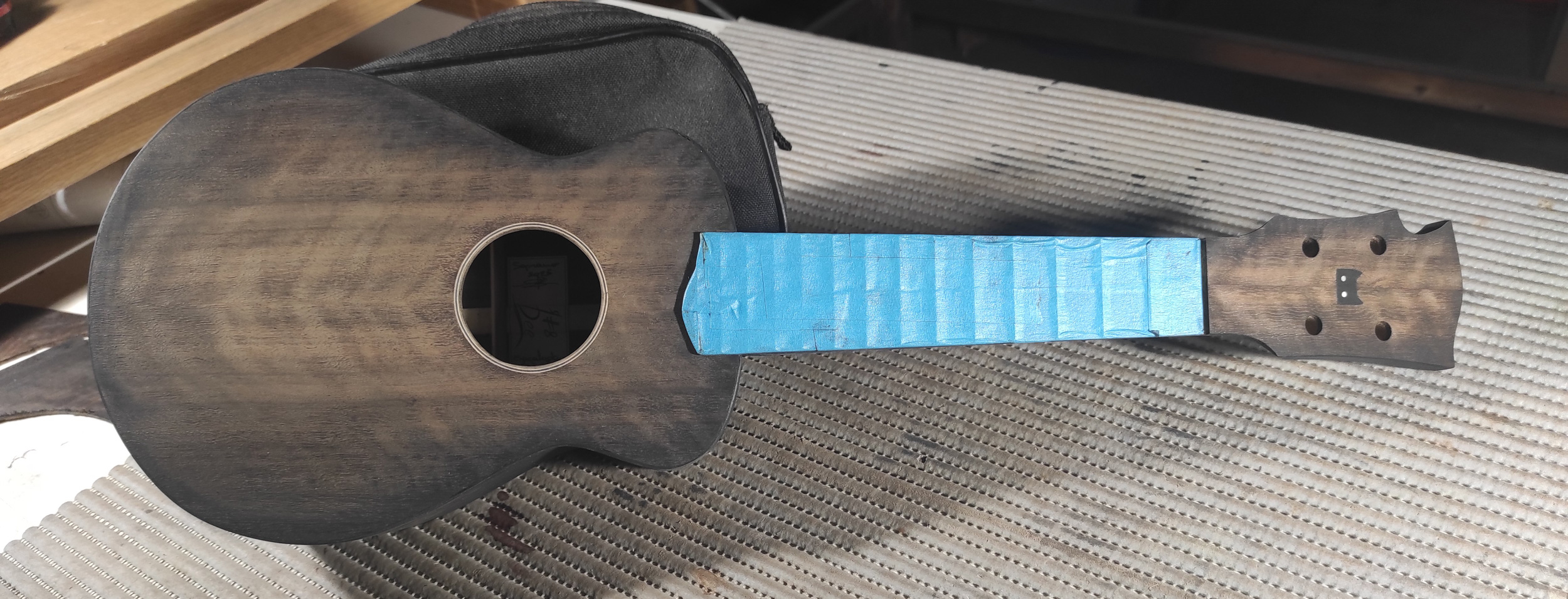 Il y a quelques années j'ai fait un truc dans la même veine sur une de mes fabrications de l'époque, un sunburst (très burst le sun pour le coup) et vernis par dessus, ça donnait ça !